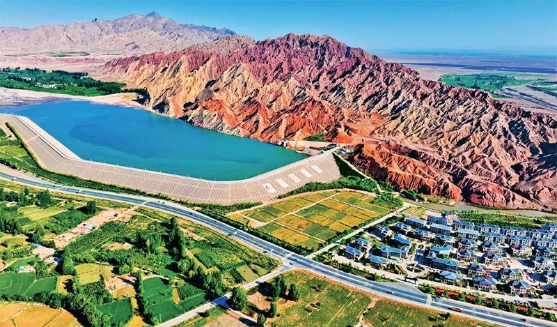 黨的十八大以來,經(jīng)過頑強努力,我國天更藍、地更綠、水更清,萬里河山更加多姿多彩。圖為2023年6月15日,甘肅省張掖市臨澤縣的紅山灣水庫與丹霞美景構(gòu)成一幅“戈壁水鄉(xiāng)”生態(tài)和諧絢麗多彩的畫卷。人民圖片 王將/攝