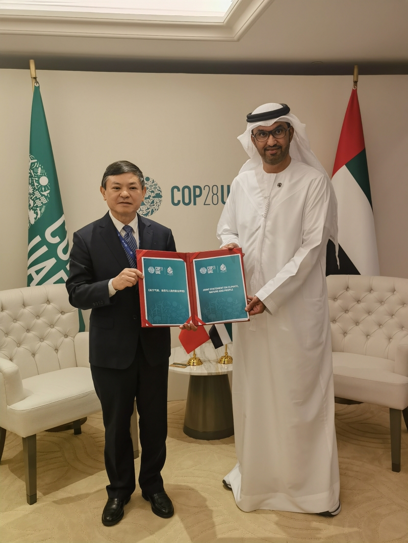 大會期間,黃潤秋與COP28主席蘇爾坦舉行會見。黃潤秋表示,中方期待COP28遵循《聯(lián)合國氣候變化框架公約》及其《巴黎協(xié)定》目標、原則及相關安排,聚焦行動與合作,敦促發(fā)達國家提供資金、技術及能力建設等方面支持。蘇爾坦感謝中方的全力支持,表示愿與中方加強交流聯(lián)系,攜手推動COP28取得成功。